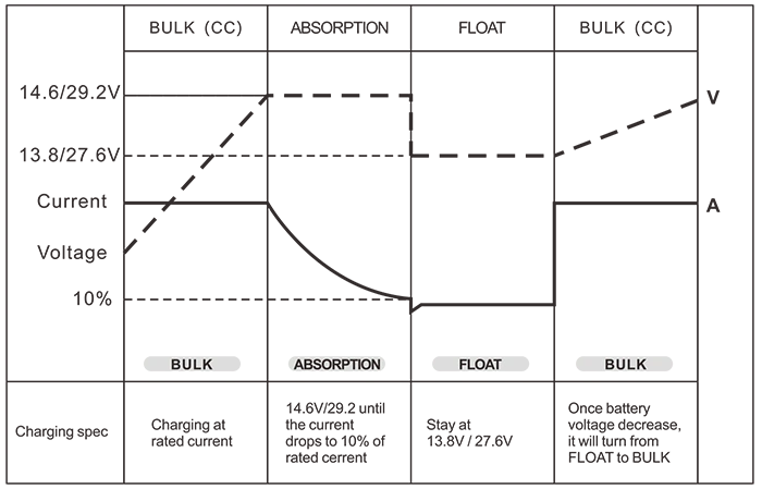 Control de batería (cargadores de batería de 3 etapas) A granel/Absorción/Flotación